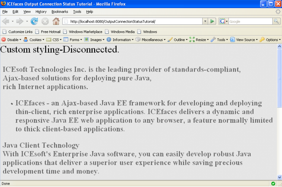 The style of the outputConnectionStatus component is customizable to a user's preference. As shown in the above examples, the styling and positioning are determined by the css file that comes with the ICEFaces framework:
