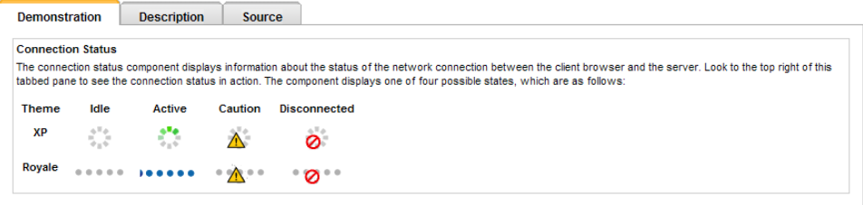 The outputConnectionStatus component displays information about the status of the network connection between the client browser and the server. The component displays one of 4 possible states, which are as follows.
