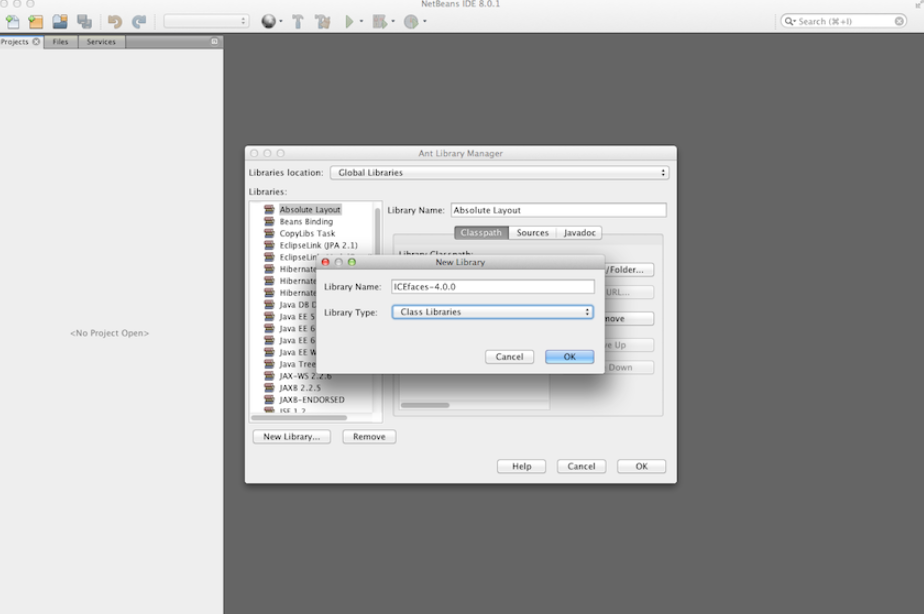 Check the release notes of the particular ICEfaces bundle you have downloaded to determine which versions are supported. Reviewing ICEfaces-4.0.0-RC1 release notes indicates Mojarra 2.2.7 is supported, so that would be the version we will include in this project. This matches what NetBeans 8 is considering the jsf 2.2 library, but if you are updating libraries, you may need to create an additional JSF library.