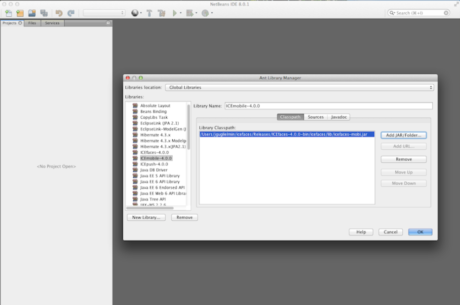 You will want to group create your Netbeans ICEfaces libraries based on your project requirements. This tutorial has grouped the icefaces.jar with the icefaces-ace.jar, and left icefaces-mobi.jar and icepush.jar in their own defined library. If you know you are going to want the mobile components without ace, then you would include the icefaces.jar with the icefaces-mobi.jar. If you are unsure, then you may want to have separate libraries for each of the 4 jars. Both icefaces-mobi.jar and icefaces-ace.jar require icefaces.jar.