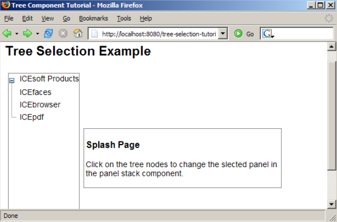 Setting up a tree component for user interaction is a relatively simple process which utilizes actionListener mechanisms in the JSF framework. Each tree node's backing bean is responsible for setting a selected panel in the panelStack component. The component nature of JSF allows for easy encapsulation of application logic which makes the application quick to build and debug. The follow is a screen shot of the tree-selection demo.