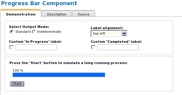 In the case of this tutorial, a combination of inputText and selectOneMenu components are used to allow the user to choose their own labels and position. The above attributes are then applied to the progress bar in a way similar to the following: