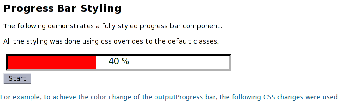 Other CSS changes were done to help display the possibilities, and since all the relevant classes are accessible to the developer the outputProgress style can be completely changed.