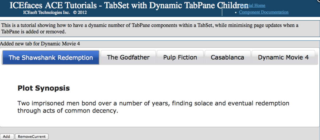 In the constructor, configurable tabs are demonstrated. Editing the included message bundle at tabSet-dynamic-tutorial/src/main/resources/messages_en.properties will be reflected in the tabs shown. Tabs can be added or removed by adding or removing the tab id from the comma delimited list under the movies key in the resource bundle, and then adding or removing the corresponding title and plot entries.
